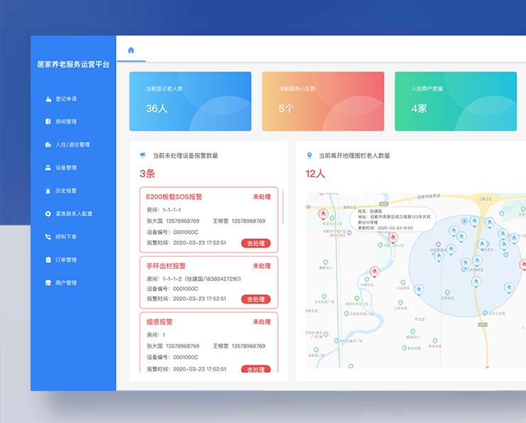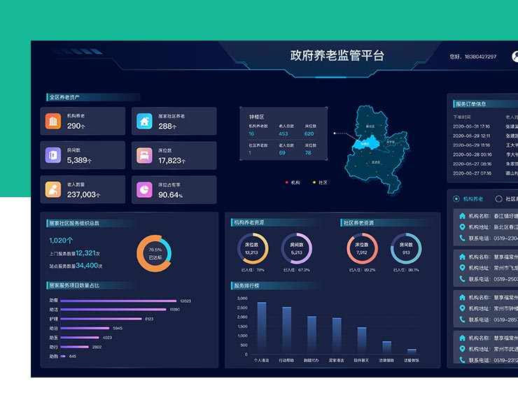 老人個人信息,勞恩服務(wù)數(shù)據(jù),老人服務(wù)狀態(tài),服務(wù)線上監(jiān)管,各項數(shù)據(jù)實時監(jiān)控